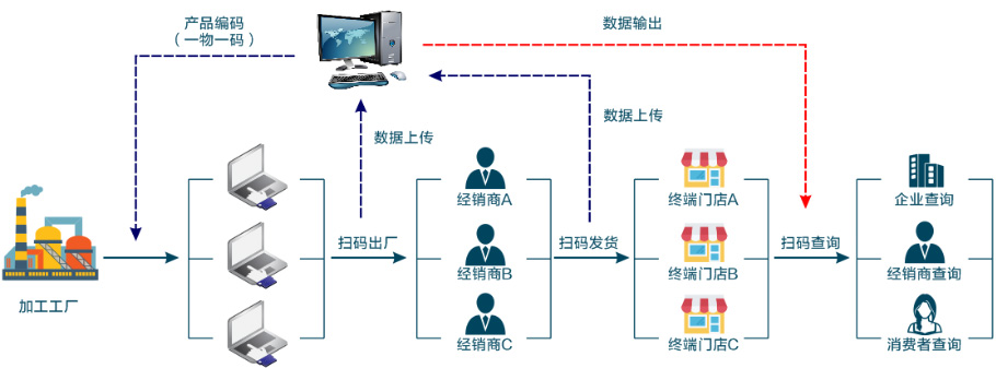 建立防竄貨管理系統(tǒng)、通過條碼、二維碼標簽賦予產(chǎn)品身份號碼,實現(xiàn)托盤,包裝箱及產(chǎn)品一對N式的相關套標管理。