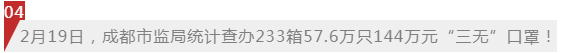 警方陳述:成都成華街道凌晨1點查獲了233箱57.6萬只口罩,無廠名廠址、無生產(chǎn)商、無生產(chǎn)標(biāo)準(zhǔn)和日期等等,屬于“三無”產(chǎn)品,涉案金額大概144萬元,已被成都成華區(qū)市場監(jiān)管局依法扣押!