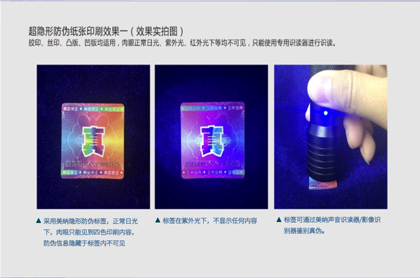 均無(wú)法被發(fā)現(xiàn)、被破壞、被復(fù)制、被仿造。通過(guò)明碼防偽標(biāo)簽+隱形防偽暗碼雙重功能,讓假冒產(chǎn)品無(wú)所遁形。