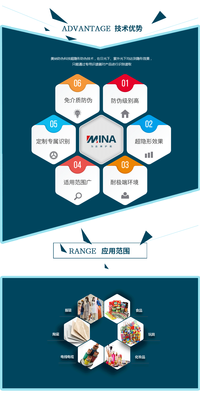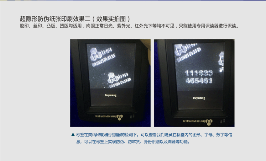 美納超隱形防偽技術(shù),可與各種材料載體完美結(jié)合,使防偽與防竄貨信息隱匿于材料載體中,通過(guò)肉眼、或是紫外光、紅外光等其他傳統(tǒng)檢查設(shè)備,